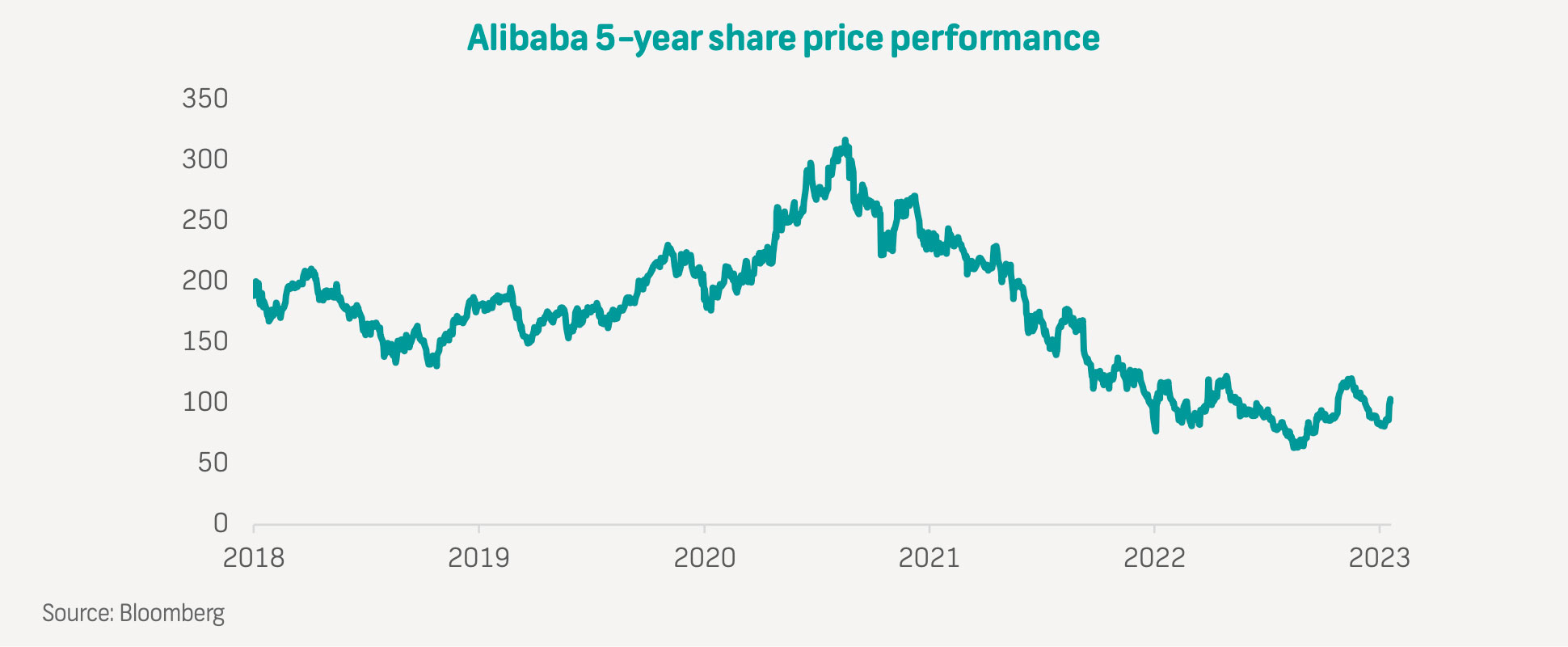 While we have seen a recovery in the Alibaba share price since the start of the year, and in response to the restructuring news, the share price remains well below its 2020 peak.
