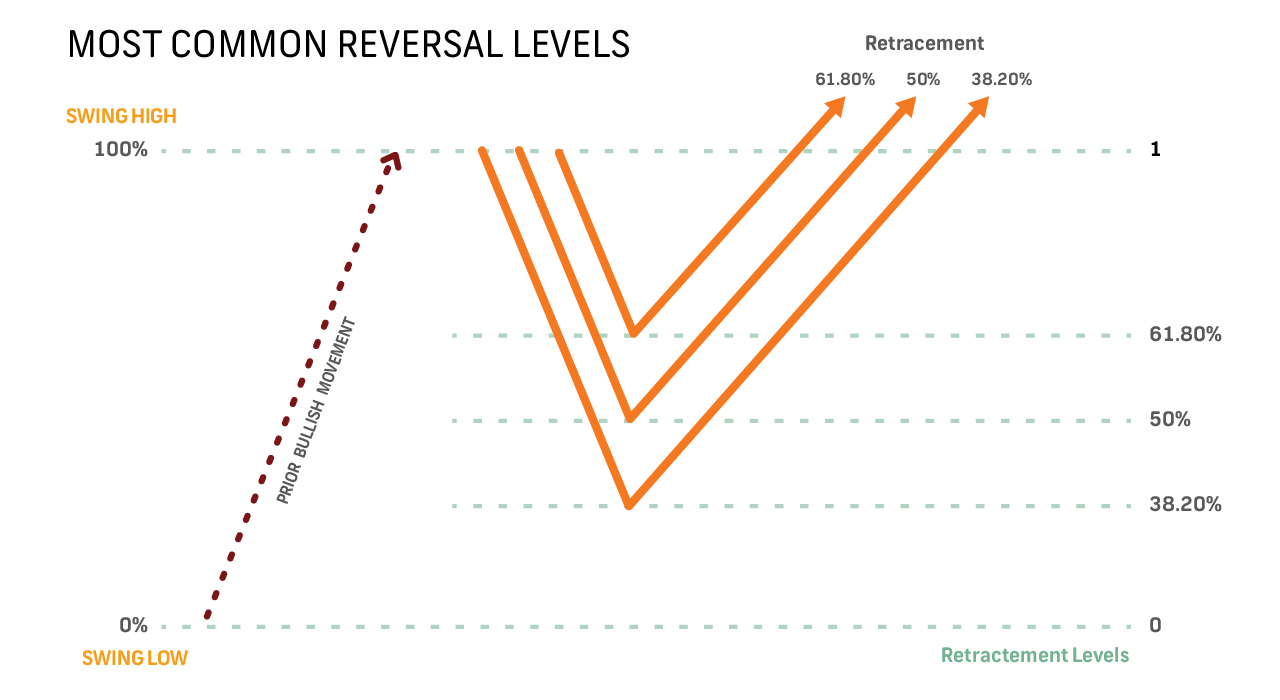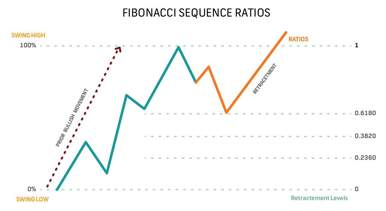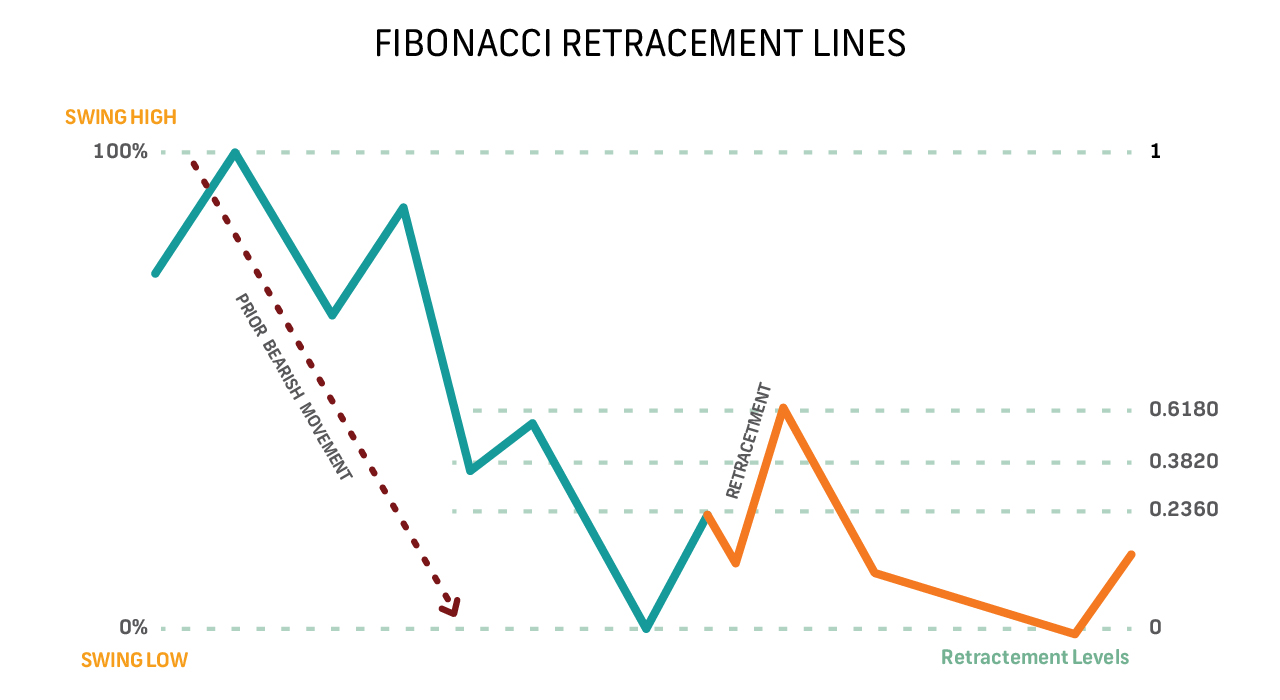 The Fibonacci sequence, in which each subsequent number is the addition of the prior two numbers, is the foundation of Fibonacci retracements. The golden ratio, or 1.6180, appears when any number in a Fibonacci sequence is divided by the number after it, while any number when divided by its predecessor produces the ratio 0.6180. Any number in the sequence can be divided by a number two spots in advance to get 0.3820, and by a number three positions in advance to get 0.2360. In nature, mathematics, and architecture, these ratios are seen everywhere Retracement levels are based on previous bullish or bearish action. First, a trendline is drawn from the low to the high of a prevailing trend. Then, Fibonacci retracement lines are drawn at 61.80%, 38.20%, and 23.60% of the line's height. Retracement lines for bullish movements begin at the movement's peak (the 23.60% line is closest to the peak of the movement), but for bearish movements, retracement lines are calculated from the bottom (the 23.60% line is closest to the bottom).
