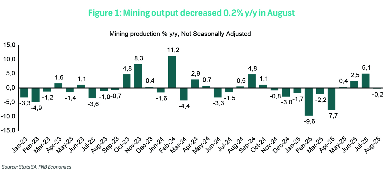 Mining production (not seasonally adjusted) marginally contracted by 0.2% y/y in August after expanding by an upwardly revised 5.1% y/y (previously 4.4% y/y) in July. The outturn was weaker than Bloomberg consensus expectations of a 1.7% y/y increase. Seasonally adjusted mining output, which is critical for quarterly GDP growth calculations, decreased by 1.2% m/m, reversing the 1.2% (previously 1.0%) monthly gain in July. In the three months to August, mining output was up by 3.3%, highlighting continued sectoral support for 3Q GDP growth, albeit likely to a lesser extent than what played out in 2Q25.