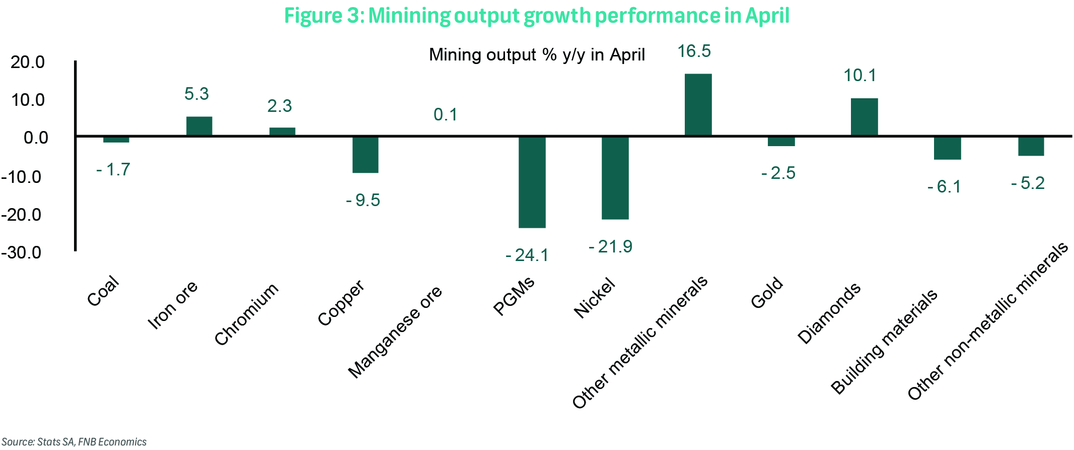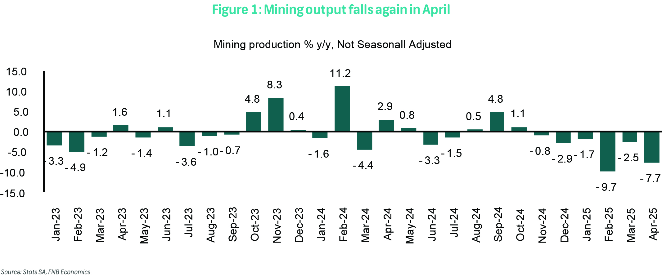 Mining production (not seasonally adjusted) remained weak into the start of 2Q25, with output contracting sharply by 7.7% y/y in April following a 2.5% decline in March (revised from -2.8%). This marked the sixth consecutive month of annual decline. The outcome was worse than the Bloomberg consensus forecast of a 4.0% decline and largely reflected the disruptive impact of breakdowns and third-party supply issues affecting Platinum Group Metals (PGMs). Seasonally adjusted mining output rose modestly by 0.6% m/m, a moderation from the 3.6% monthly increase recorded in March.