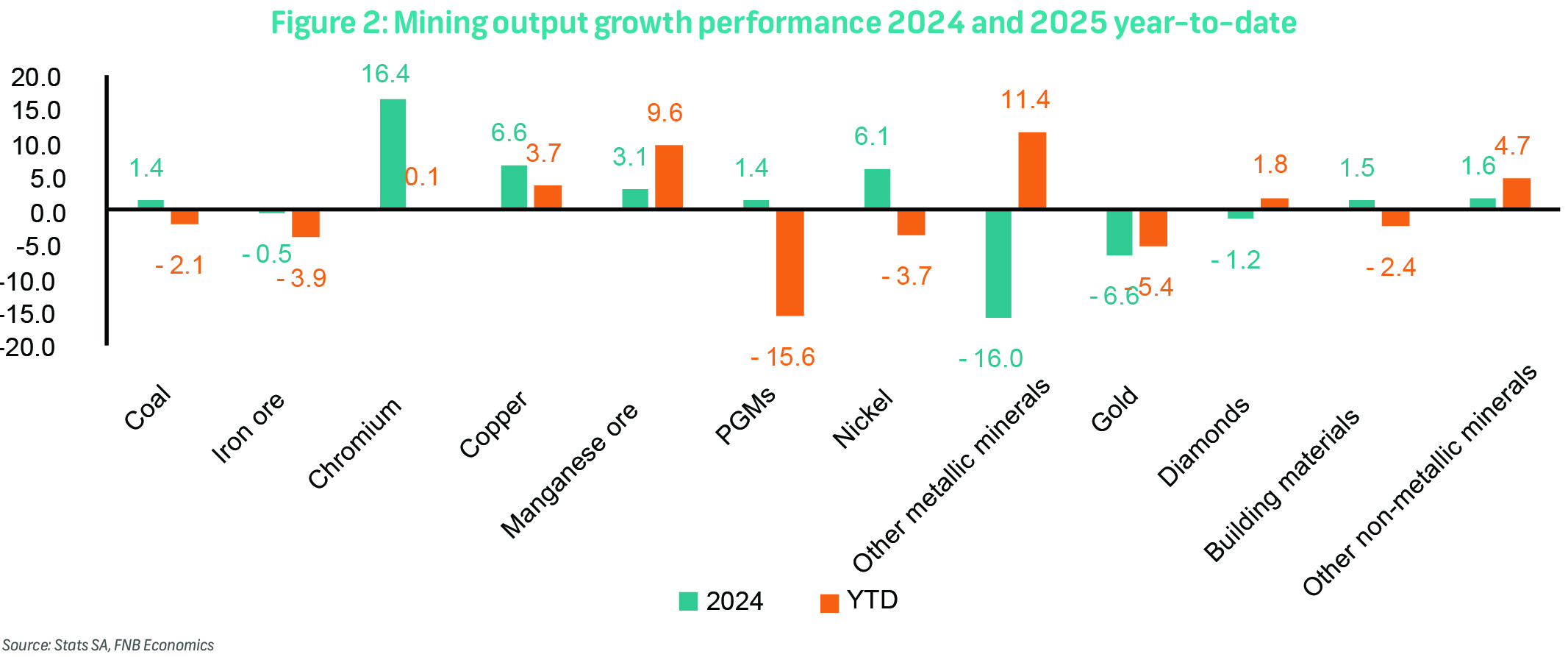 Near-term mining activity remains under pressure from slowing global growth and persistent global uncertainty. Although output edged up by 0.4% in 2024, year-to-date performance has been disappointing, with output down 5.4% in the first four months compared to the same period last year. This points to a negligible or potentially negative contribution from the mining sector to 2025 GDP growth, reinforcing our view of downside risks to the economic outlook. The medium-term outlook should be supported by ongoing infrastructure reforms, particularly in energy and logistics. However, how the global economy evolves will also be critical in determining the mining sector's response.
