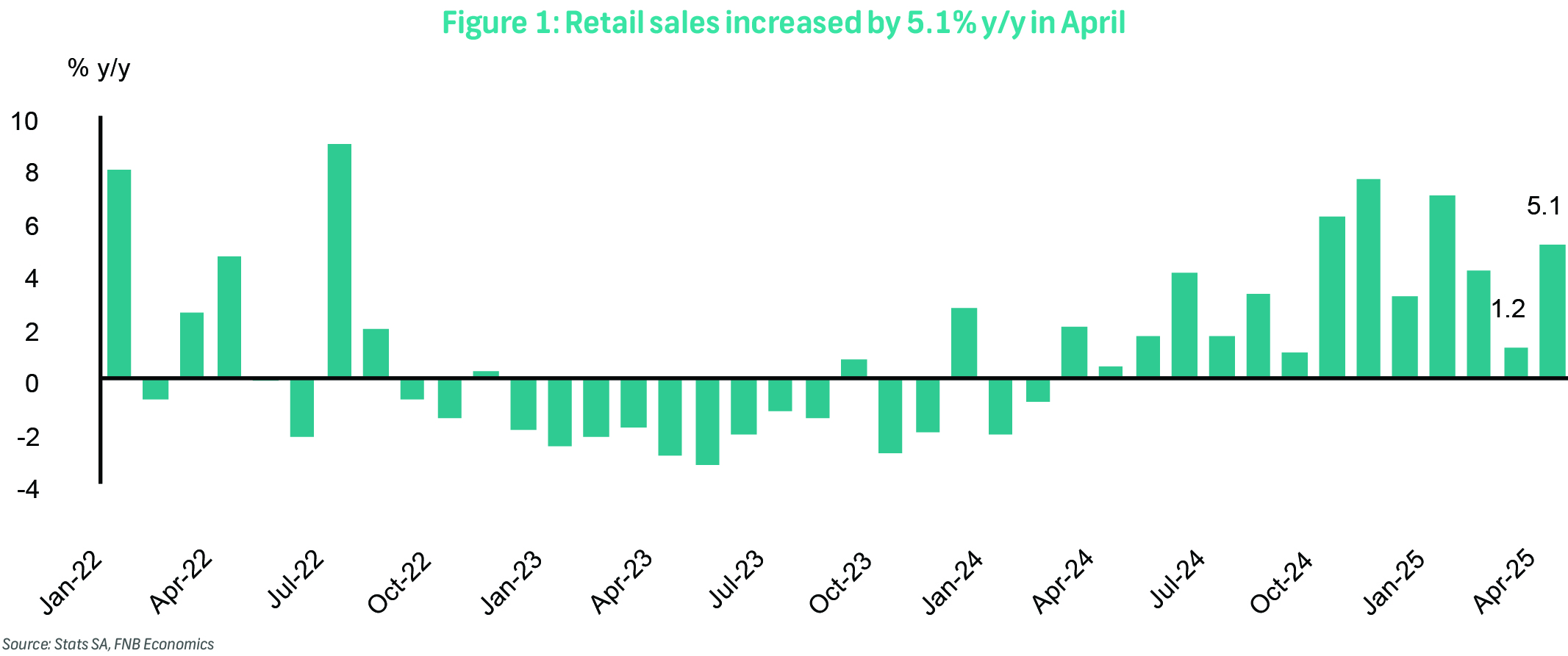 Consumer spending began 2Q25 on a strong note, with retail sales rising by 5.1% y/y in April—up from a revised 1.2% in March (previously 1.5%), and significantly above market expectations of a 3.1% increase. On a monthly basis, retail volumes rebounded by 0.9%, following a 0.3% decline in March. Despite April's strong performance, retail activity over the past three months remains 0.5% lower compared to the preceding three-month period. This suggests that household spending may be losing momentum, potentially weighing on broader economic growth. The spike in annual sales likely reflects holiday-related spending and two-pot pension withdrawals coinciding with.