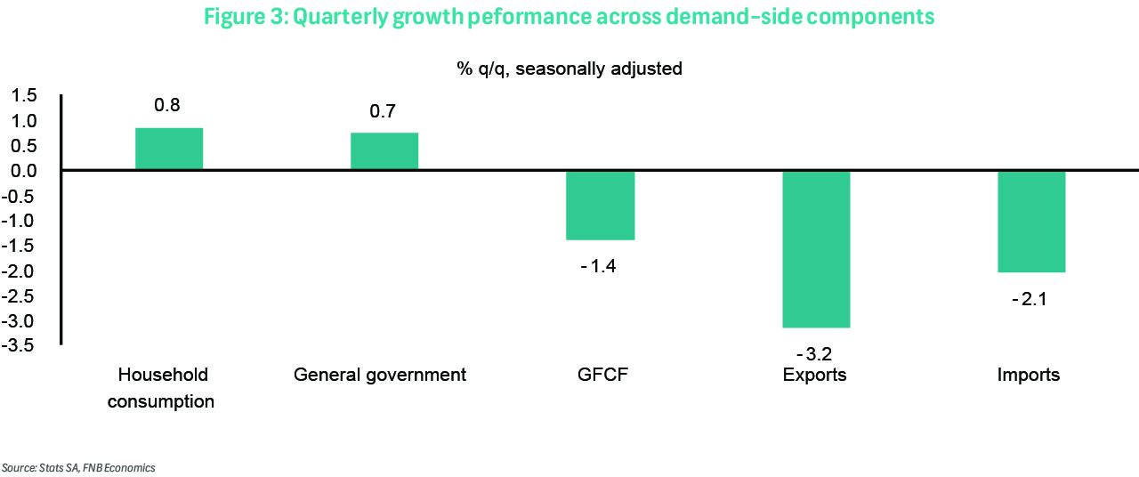 Gross capital formation rose 2.2% q/q, reflecting inventory restocking of R16.6 billion (annualised) following a R6.7 billion destocking in the prior quarter, contributing 0.5ppts. However, gross fixed capital formation (i.e., investment in long-term productive assets) declined 1.4% q/q, largely due to a 33.5% drop in public corporation investment and a 3.4% fall in government investment. Private business enterprise investment rose 5.6% q/q, despite subdued confidence, policy uncertainty, and weak demand, though it remains down 0.3% y/y after a 6.5% fall in 1Q25. While the rebound is encouraging, the year-to-date decline of 3.4% suggests our forecast for a mild contraction may need downward revision, though annual GDP growth is unlikely to be affected given the strong performance in other components.
