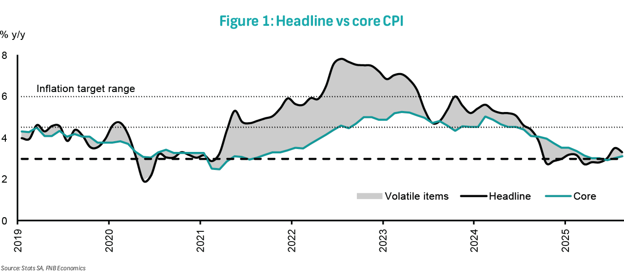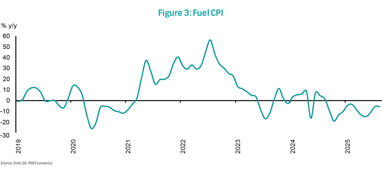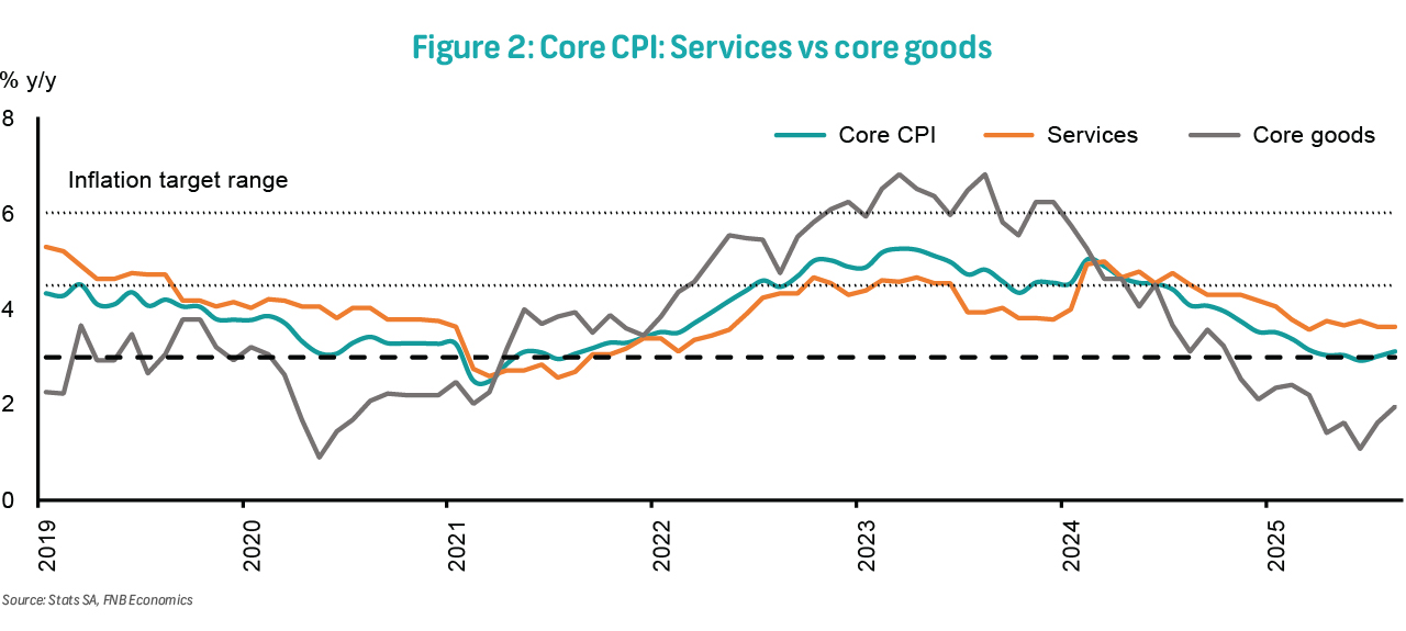 The 3Q25 inflation expectations survey reflected further slowing over the various time horizons. Importantly, over the two-year monetary policy implementation horizon, expectations have softened from 4.5% to 4.2%. Meanwhile, longer-term expectations are at their lowest since 2011, recording 4.2% from 4.4% previously. Nevertheless, this slowing was driven by analyst expectations, which trend towards the Monetary Policy Committee's (MPC) 3% objective, while business and labour unions remain anchored above 4%. This highlights some rigidity in shifting towards the new de facto target by price setters. Furthermore, any hesitance by government to officially support the lower target may affect the credibility and efficacy of the adjustment process. Fortunately, oil prices are expected to remain soft while other import costs should be contained by the influence of cheaper products from the East as well as a resilient rand. This will assist with managing headline inflation, while restrictive monetary policy keeps core inflation muted.