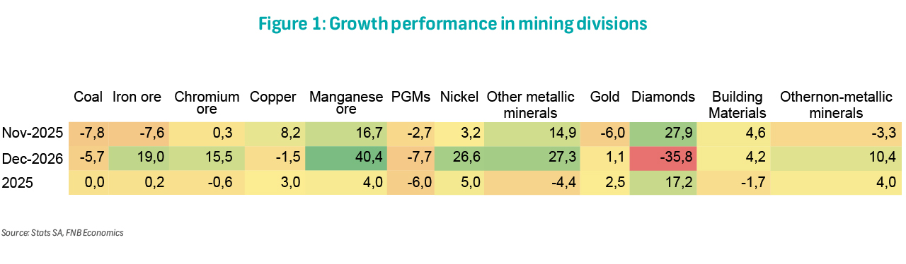 Negative growth in 2025 was recorded in coal (-0.6%), copper (-6.0%), platinum group metals (-4.4%), gold (-1.7%) and other non-metallic minerals (-2.0%).
