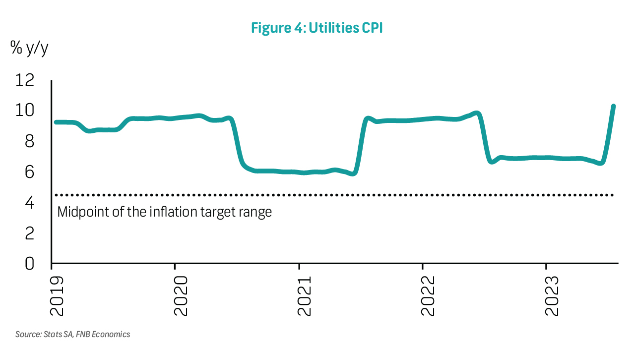Municipal electricity tariff increases averaged 14.2%, following Eskom's 18.65% increase in April. With the latest municipal tariff hikes, utilities inflation lifted from 6.7% in June to 10.3% in July.