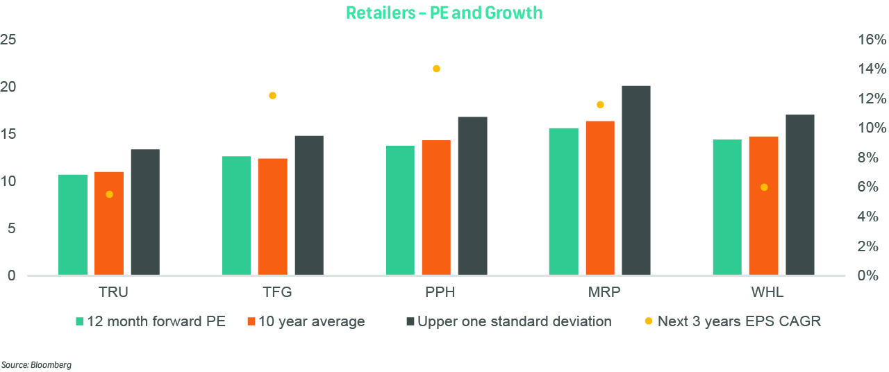 Among the larger discretionary retailers listed on the JSE, most are trading above their two- and five-year average PE ratings, however, delving into history and looking at growth rates changes the picture somewhat. All these retailers, bar TFG, are trading below their ten-year average forward PE's and all these names are trading a long way off the upper end of their fair value range as expressed by the standard deviation. Growth still looks very solid over the next three years for TFG, PPH and MRP. With the above tailwinds in mind, including the two-pot windfall, there is still opportunity in these names, even more so in the event of any short-term weakness.