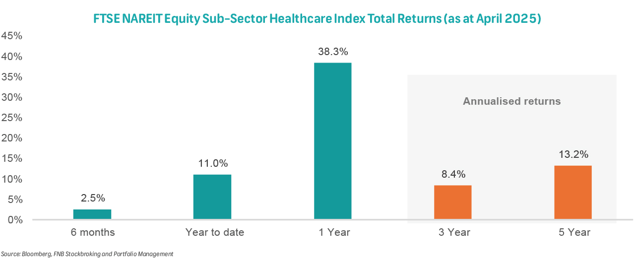 Healthcare REITs accounts for ~14% of the market capitalisation of the FTSE NAREIT All Equity Index according to recent data - this is more than quadruple the sector's weight in 2000. It was the third-best performing sector of 2024, posting a total return of 24.2%. This positive momentum has continued into 2025 with the sector being among the top performers (against other sub-sectors in the NAREIT index) with year-to-date total returns of ~11%.