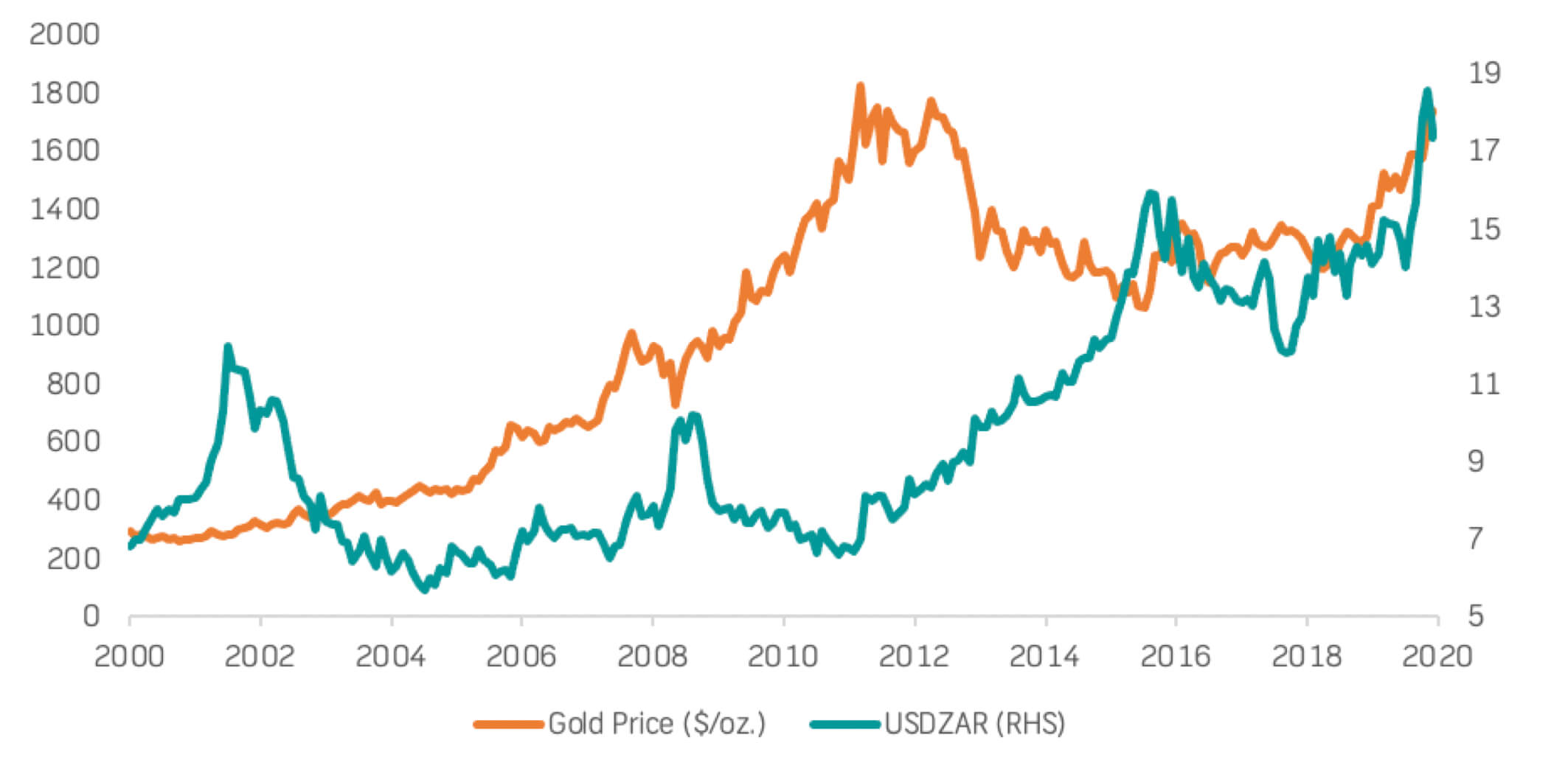 20-year gold price in USD/oz. and the USD/ZAR exchange rate
