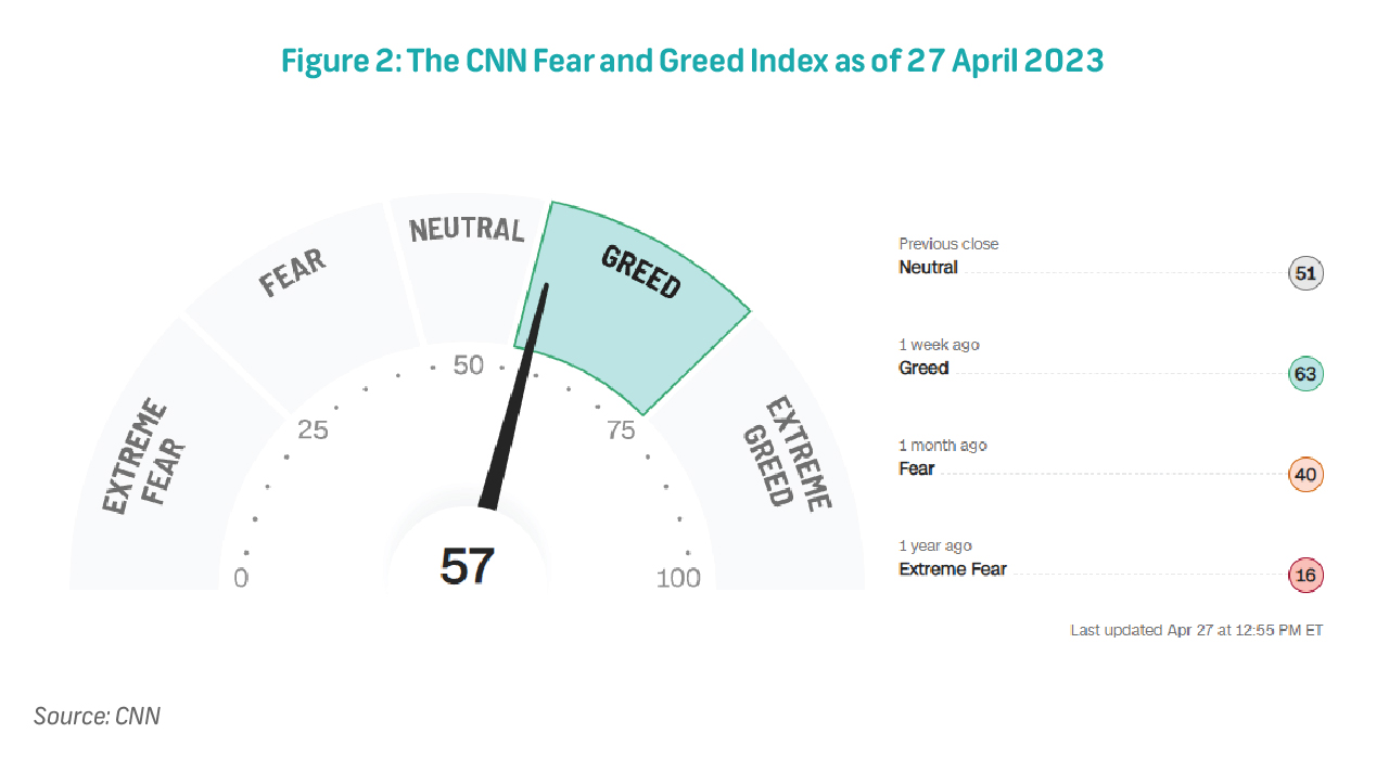 China is boasting its strongest economic recovery (relative to estimates) in 17 years, with recent GDP data showing that the economy expanded ahead of expectations in 1Q23 (+4.5% y/y, 4Q22: +2.9% y/y) on the back of a better-than-anticipated recovery from harsh Covid-19 lockdown conditions. This reading was complemented by a slew of robust economic data releases including March numbers for retail sales (+10.6%, ahead of expectations), industrial production (+3.9%, in line), and unemployment (5.3%). The region's modest growth target of ~5.0% for 2023 (2022: +3%) is still achievable as the economic recovery gains traction. This is also expected to be the main driver of global economic expansion in FY23 as persistent monetary tightening in other major economies continues to slow down economic growth. In terms of performance, the MSCI China Index (-2.7%), however, has lagged global peers as ongoing geopolitical tensions appear to be adversely affecting flows. European equities (STOXX Europe 600: +5.1%) performed well as the region recovered from the sell-off towards the end of March. This was underpinned by stronger-thanexpected economic data thus far.