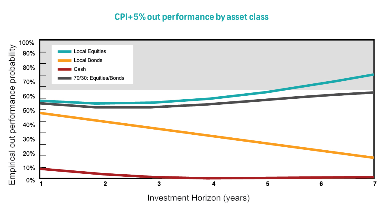 Historically, as investment horizons have increased, risky assets like equities have had a much higher chance of beating a real benchmark like inflation plus 5%. Over some short horizons, less risky assets have a reasonable chance of beating this benchmark - but as the investment horizon increases, the likelihood of this happening decreases, as shown left in Figure 1.