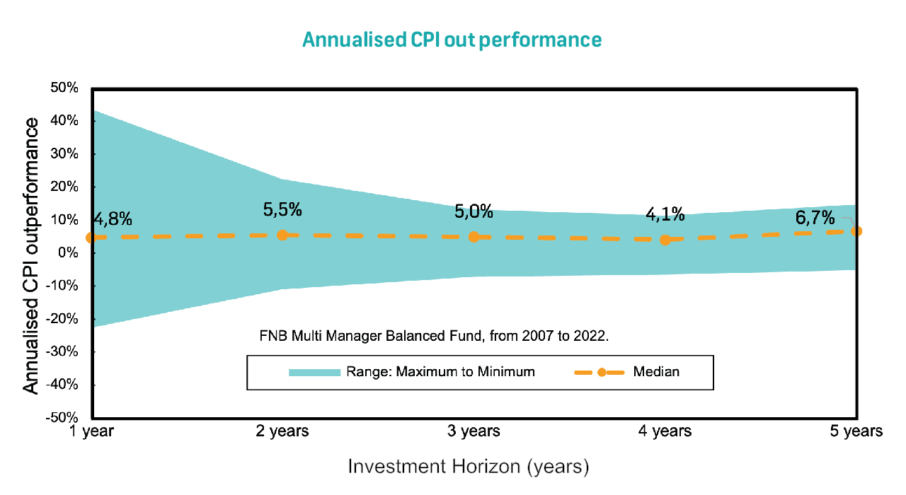 A practical illustration of this is seen looking at our FNB Multi Manager Balanced Fund, which has a benchmark of CPI + 5% over 7-year horizons, and 1st quartile performance over 15 years. While the fund has given some very strong 1-year returns, and some drawdowns over 1-year horizons, the range of outcomes narrows significantly as the investment horizon increases. The 'cone of uncertainty' is a term used in software development which describes the amount of uncertainty during a project's lifetime. The same concepts hold for managed investments - uncertainty is at its highest in the short-term, but this narrows over time. Time in the market is a valuable strategy!