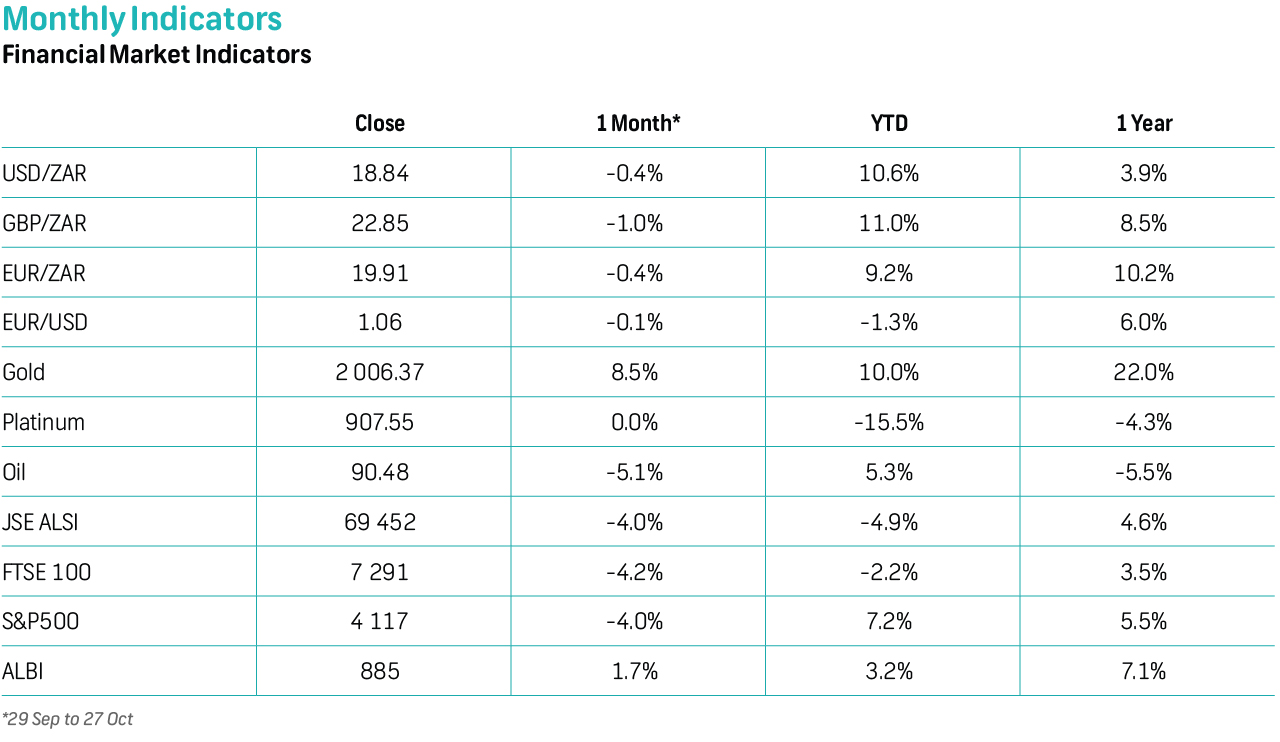 October saw another month of negative market returns across the globe with the MSCI World Index and MSCI Emerging Markets Index falling 4.2% and 3.4%, respectively. Sentiment remains dominated by elevated interest rate expectations, with recent geopolitical tensions in the Middle East, while supportive of safe haven assets such as gold (+8.5%), adding further pressure to equity markets. Another round of robust economic data out of the US (strong consumer spending numbers, labour data, and 3Q23 GDP growth) bolstered expectations for the US Federal Reserve to maintain its relatively hawkish stance with interest rates expected to remain higher for longer - expectations for a rate cut have been pushed out even further and is now only expected towards the third quarter of 2024.