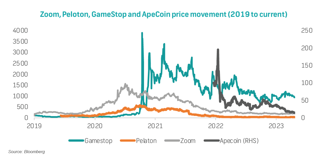 Fads can look like themes, and this is where the danger lies. Remember NFTs? People were buying up electronic art as if it was the real thing and many investors were left destitute once the bubble burst. More recently, Covid-19 exposed stocks like Zoom and Peloton were purported to have unlimited growth prospects, but people went back to the gym and are increasingly returning to the office. While some money would have been made by early investors, those who bought at the top have experienced substantial value destruction. In 2021 meme stocks were all the rage, with retail investors using message boards like Reddit to pick investments and drive-up stock prices to "show it to the man". The fundamentals were just not there, and many lost their savings in the process. Time will tell if crypto in its entirety ends up just being a fad - but certainly SH*T-coins were all the range a few years back and investors holding these tokens have little to show for their efforts.