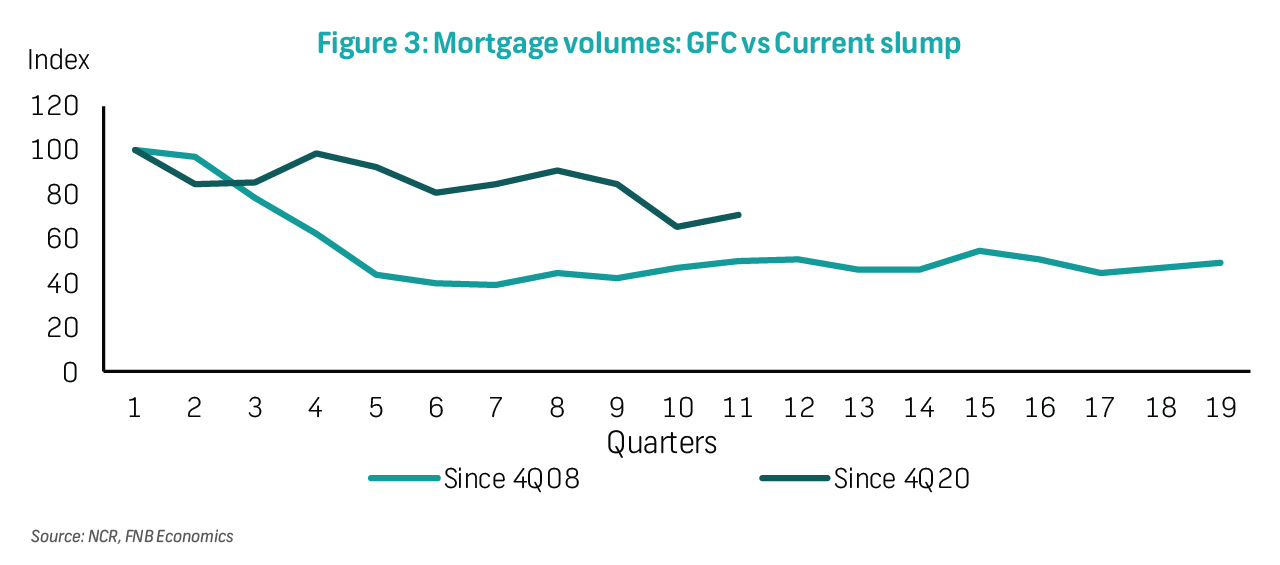 Market activity moved sideways and recorded a rating of 5.1 (out of 10) in 3Q23. At this level, agent activity rating remains below the long-term average of 5.9 (since the inception of the survey in 2004), and considerably (28.2%) lower than the most recent peak of 7.1 recorded in 4Q20. Indeed, year-to-date (January to June), National Credit Regulator (NCR) data shows that the volume of new mortgage transactions has declined by 18%. Compared to 4Q21, at the onset of the current interest rate hiking cycle, mortgage transactions have declined by approximately 24% (see our mortgage market analysis here). Nevertheless, the extent of the decline in activity has been relatively shallow compared to the global financial crisis period (Figure 3). By region, the Western Cape recorded higher activity at 5.9, still lower than last quarter's 6.2 rating. Activity in Gauteng saw a further decline in 3Q23, from 4.5 to 4.3, the lowest rating across all the regions. In KwaZulu-Natal, activity was unchanged at 5.2, while the Eastern Cape slipped to 5.4 from 5.7 in 2Q23. By price, the R500k-R750k bracket was the best performer, with a rating of 6.2, down from 6.9 previously (Figure 4). Higher activity in lower priced segments is supported by the downscaling trend amid heightened financial pressure, with homeowners across income groups searching for cheaper alternatives.