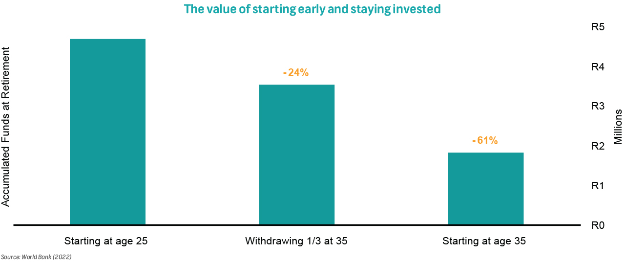 The FNB Retirement Insights Survey findings indicate that premature cashing out of retirement funds can derail well-crafted retirement plans and reduce overall financial security. For instance, consider the scenario above where you started saving for retirement at age 25. At age 35, suppose you withdraw a third of your accumulated savings, depleting your savings pot by a total of around R64,000, before being subject to income tax at your marginal tax rate. If your marginal tax rate is 36%, you're left with around R41,000 to spend. Over the next 30 years that R64,000 would have grown to over R800,000, and your savings at retirement is worse off for it. You've not only lost the principal amount, but also the future gains it could have earned over the years, leaving your retirement savings a shocking 24% lower. Adjusting for inflation, each rand withdrawn early loses you over R5 available to cash out in retirement.