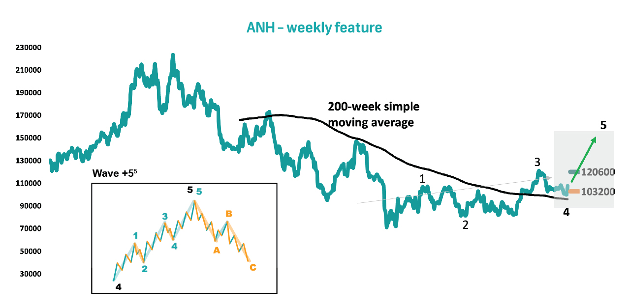 Technically, the price action indicates the start of wave 5 of the Elliott wave theory (see the wave count 1 to 5 on the main chart as well as the insert). In the Elliott Wave Theory, wave 5 represents the final impulse wave in a typical five-wave trend sequence. The price action at the start of wave 5 signals the last phase of the prevailing trend. This wave is typically characterised by a surge in price as the trend makes its final push upwards.