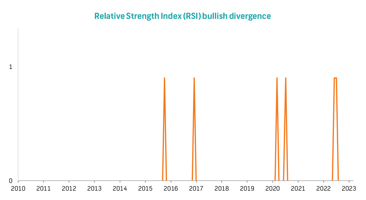 The share continues to display early signs of a bullish divergence. The share remains below its 200-day simple moving average, indicating a counter-trend trade possibility.