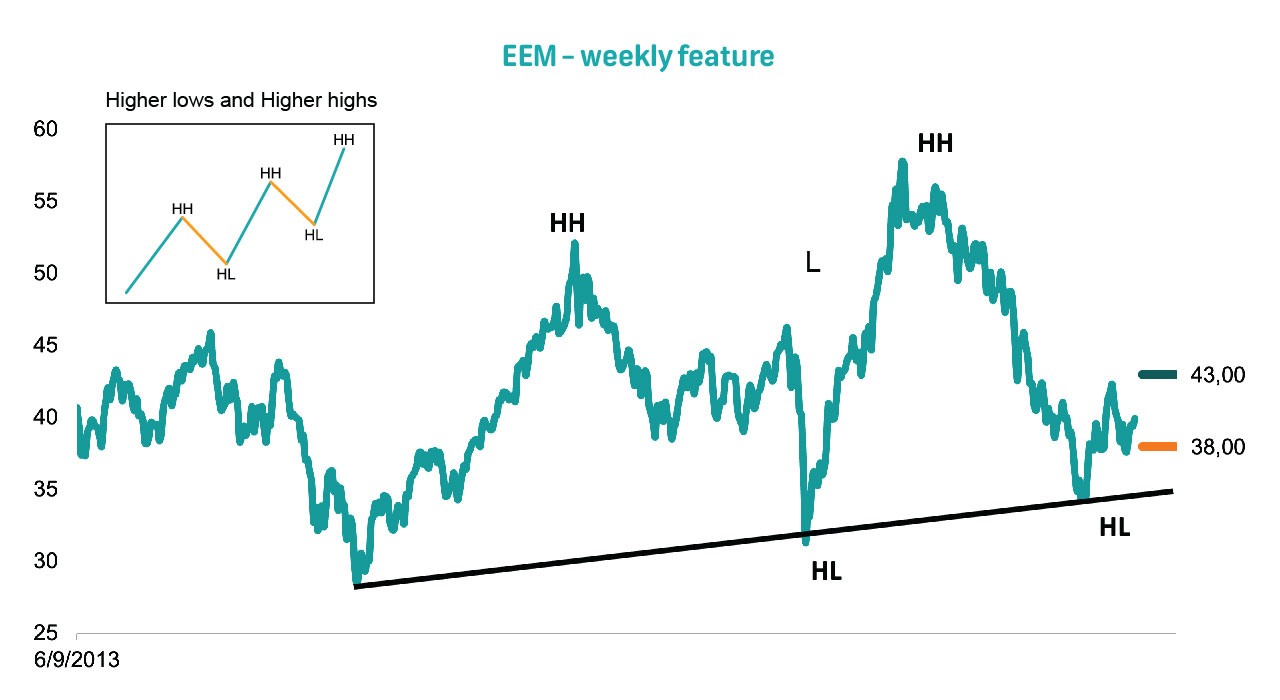 Technically, the ETF price is displaying a pattern of higher highs (HH) and higher lows (HL), suggesting a bullish trend (see the main chart as well as the insert). In essence, the ETF is undergoing a series of price retracements that extend beyond previous highs and don't fall below previous lows.