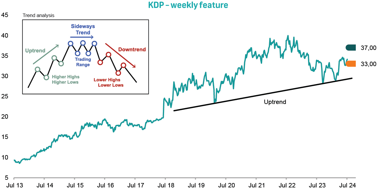 Keurig Dr Pepper (KDP US) is a leading beverage company in the United States (US), known for its extensive portfolio of soft drinks, coffee, and specialty beverages. Formed in 2018 through the merger of Keurig Green Mountain and Dr Pepper Snapple Group, KDP has leveraged its diverse product range and innovative distribution strategies to become a major player in the industry. The company boasts iconic brands such as Dr Pepper, Snapple, and Green Mountain Coffee, alongside a wide array of partner brands.