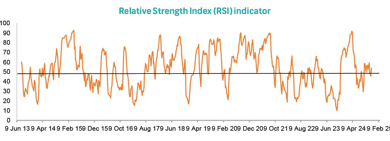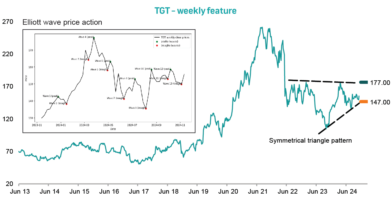 Technically, a developing symmetrical triangle pattern is supportive (see the dotted black converging trendlines on the main chart). This is a bullish pattern signalling a period of consolidation, where buyers and sellers are reaching a temporary equilibrium before a potential breakout. The pattern is formed when the stock's price makes a series of lower highs and higher lows, creating two converging trendlines. During the formation of a symmetrical triangle, volume typically contracts as the price narrows within the pattern, reflecting decreasing volatility. Once a breakout occurs, an increase in volume can confirm the upward move.