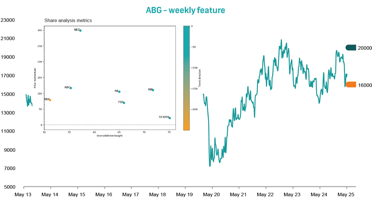 Technically, a peer comparison of South African banking and financial shares based on price momentum, oversold/overbought levels, and trend direction, shows that Absa presents a balanced technical profile with moderate momentum and a relatively neutral positioning on the oversold/overbought scale (see insert on the main chart). This suggests that the share price may be consolidating and could be poised for a potential upward shift should sentiment improve. Ultimately, Absa's steadier placement relative to its peers may offer a more favourable risk-adjusted entry point.