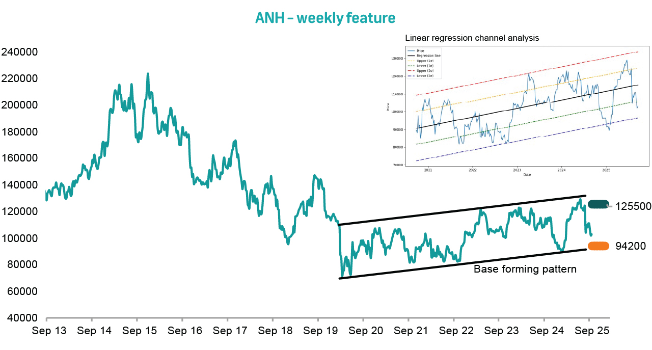 | The price remains below both its 200-day and 200-week simple moving averages (SMA) of R1 101.83. | |
