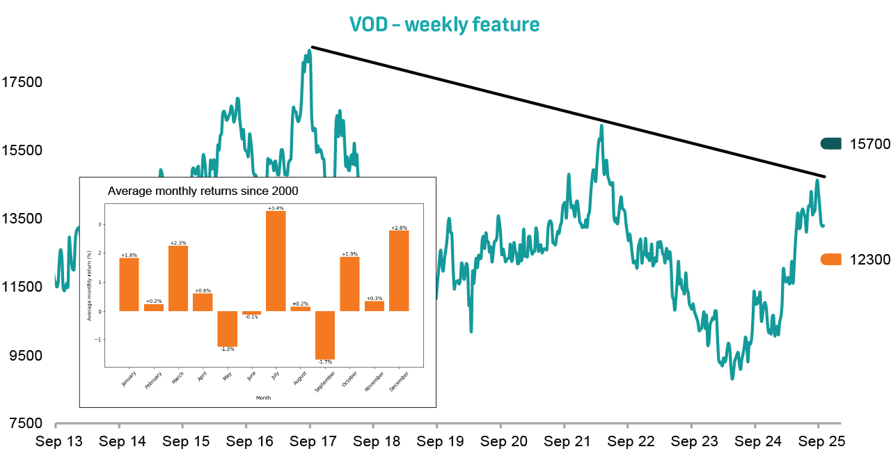 Seasonal strength from October to December supports a bullish case for the share (see the insert on the main chart). This pattern highlights that Vodacom delivers strong average returns from October through December. The strong turnaround between September's weakness and October to December's strength suggests that downside pressure may be exhausted.