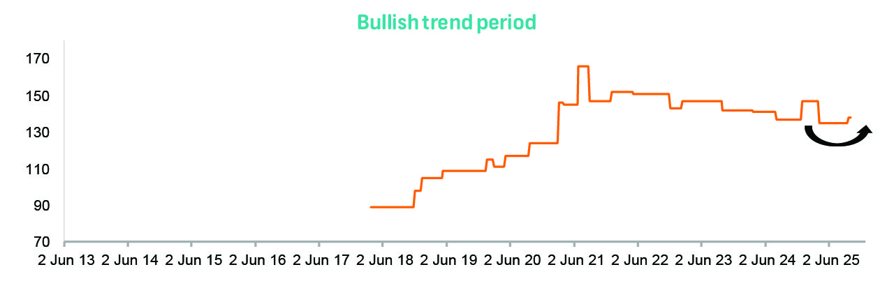 | Comment | Low volatility suggests market stability and possible accumulation, while price action stays above the 200-day SMA. Fading downside momentum supports maintaining a bullish stance. Profit target remains R157.00 with stop-loss at R123.00 and trailing stop at R126.00. | TPrice action remains within the upward-sloping linear regression channel but below the 200-day SMA, framing this as a counter-trend trade. Fading downside momentum supports the setup. Profit target is R1 255.00, with both initial and trailing stop-loss at R942.00. | An upward-tilted broadening top pattern remains of interest, with price action holding above the 200-day SMA. Emerging downside momentum is a concern for the trade. Profit target stays at R150.75, with an initial stop-loss at R127.00 and trailing stop at R127.30. |