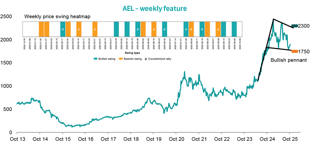 | Comment | A developing falling wedge persists above the 200-day SMA, though fading upside momentum poses concern. We retain a profit target of R227.00, with a trailing stop at R169.00. | A low-volatility phase suggesting market stability and accumulation remains notable. The price stays above the 200-day SMA, with fading downside momentum supporting the trade. We maintain a profit target of R157.00 with a trailing stop at R128.00. | The price remains within an upward-sloping regression channel but below the 200-day SMA, framing this as a counter-trend trade. Fading downside momentum supports the setup. We maintain a profit target of R1 255.00 and a trailing stop at R944.00. |