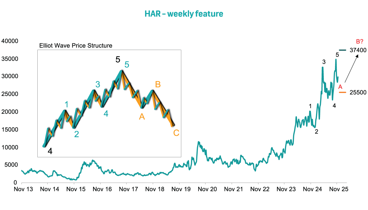 A high US dollar gold price supports a bullish outlook for Harmony Gold, which closely tracks gold as a leveraged proxy. The recent gold pullback appears to have been constructive, with recent activity suggesting re-accumulation before the next upward phase.