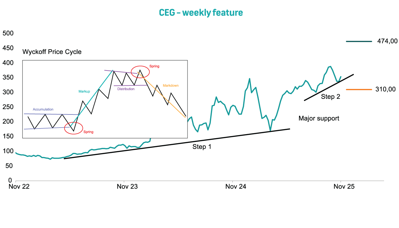 Stepwise support also lends bullish support to the stock (see the black trendlines marked with Step one and two on the chart). This pattern highlights a market that is consistently forming higher support levels after each pullback, indicating that buyers are stepping in earlier than before.