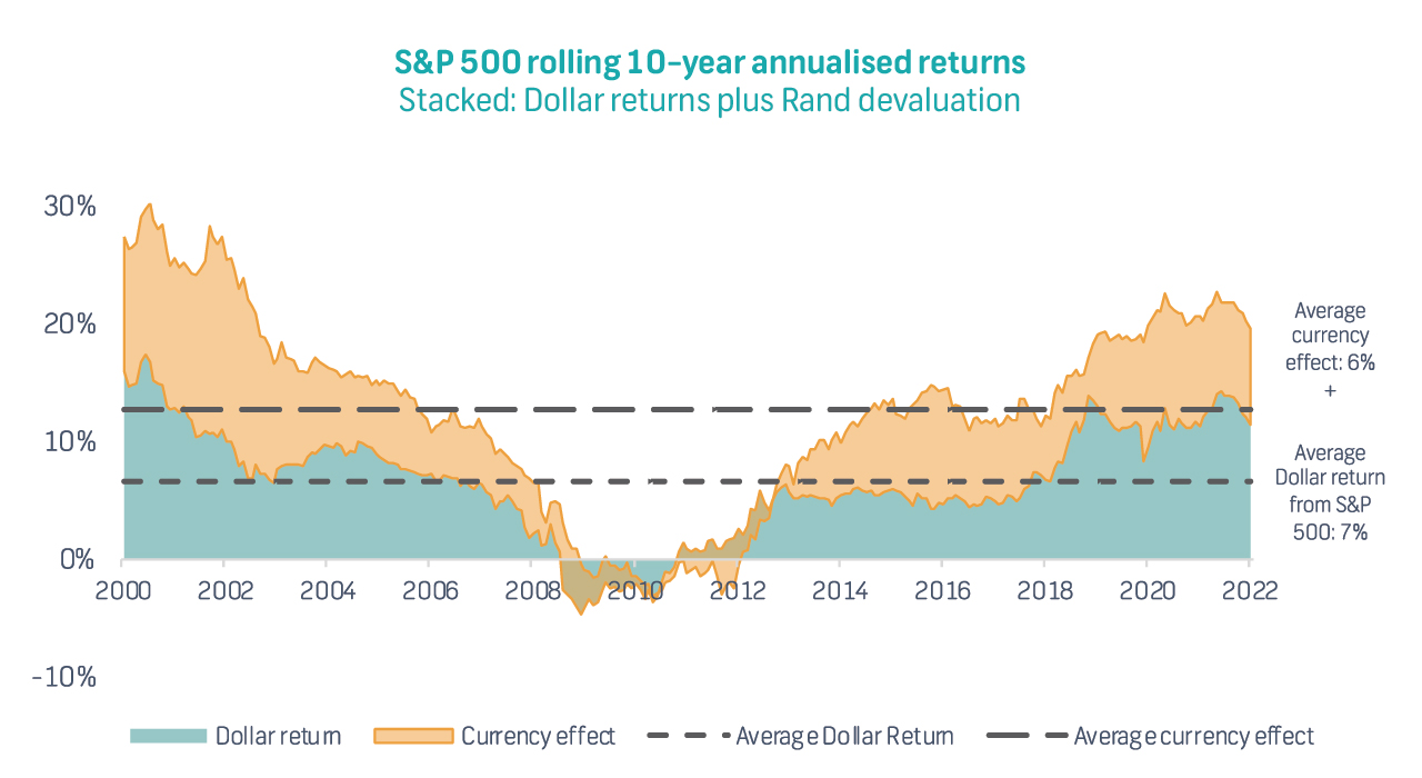 The Rand volatility can further complicate matters and return profiles of offshore investments are heavily influenced by the currency, thus requiring careful consideration. Over time the Rand tends to depreciate (adding to the value of offshore investments in local currency) and importantly it does tend to weaken during times of market stress (see Figure 1 above), cushioning the impact of ailing offshore assets in the overall portfolio. This is not always the case though, as demonstrated by the Rand strength during much of the recent market volatility amidst the Russia - Ukraine conflict.