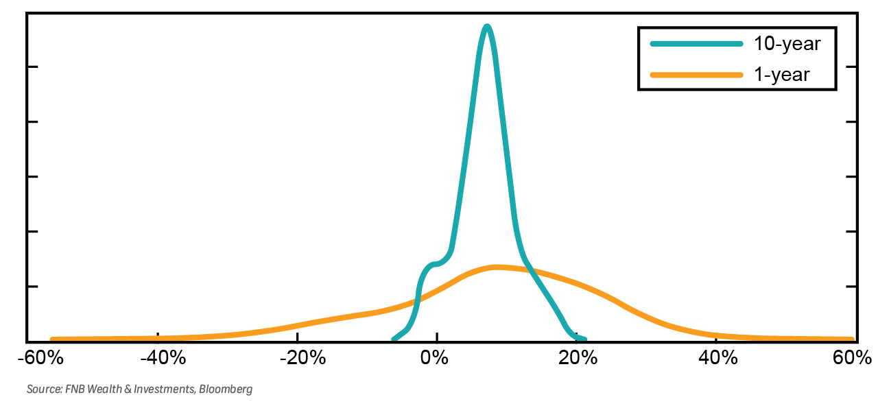 The effect of a Rand-based investor holding global equities is shown below - while over the long-term, the devaluation of the Rand has resulted in an augmentation to total returns, it also increases the breadth of potential outcomes, especially over the shorter term. Strong offshore equity performance could be coupled by a weakening Rand, giving strong returns - but weak offshore equity performance could also be coupled by a strengthening (or stable) Rand, only serving to exacerbate those weak returns.